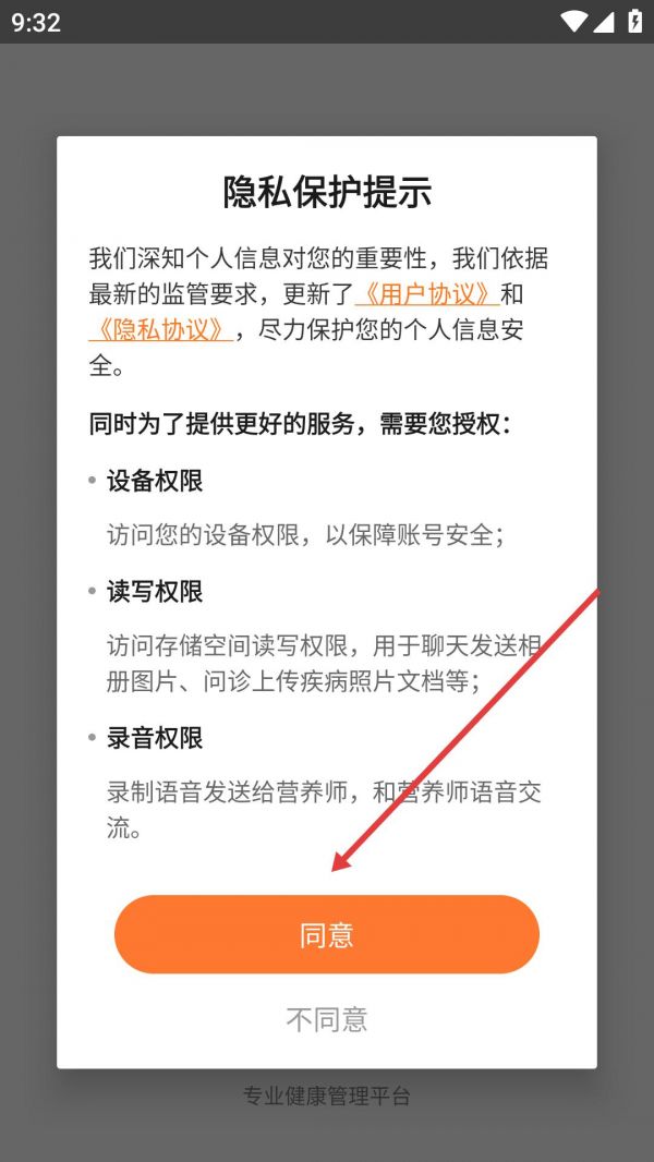 1、下載安裝完成后進(jìn)入,需在用戶協(xié)議和隱私政策界面點(diǎn)擊同意,接受相關(guān)條款后才能進(jìn)入應(yīng)用。