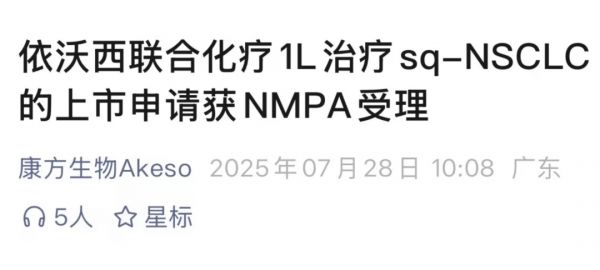 2025 年 7 月,基于 HARMONi-6 研究的優(yōu)異結(jié)果,依沃西單抗注射液的第三項適應(yīng)癥申請已獲受理,擬用于聯(lián)合化療一線治療晚期鱗狀 NSCLC。[6]