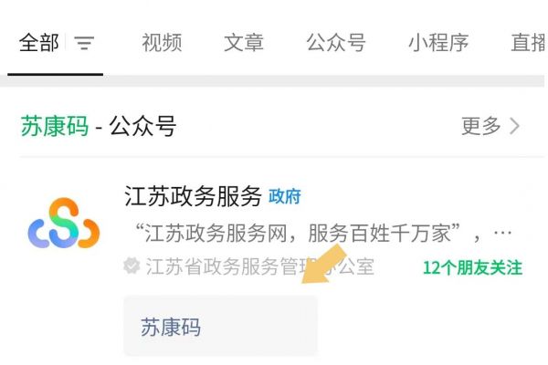 需要注意的是,因為“蘇康碼”只適用于江蘇省,當?shù)貙⑼ㄟ^微信申請、查看“蘇康碼”的方式放在了“江蘇政務(wù)服務(wù)”公眾號名下,搜索時要注意查看,然后點擊“蘇康碼”即可。