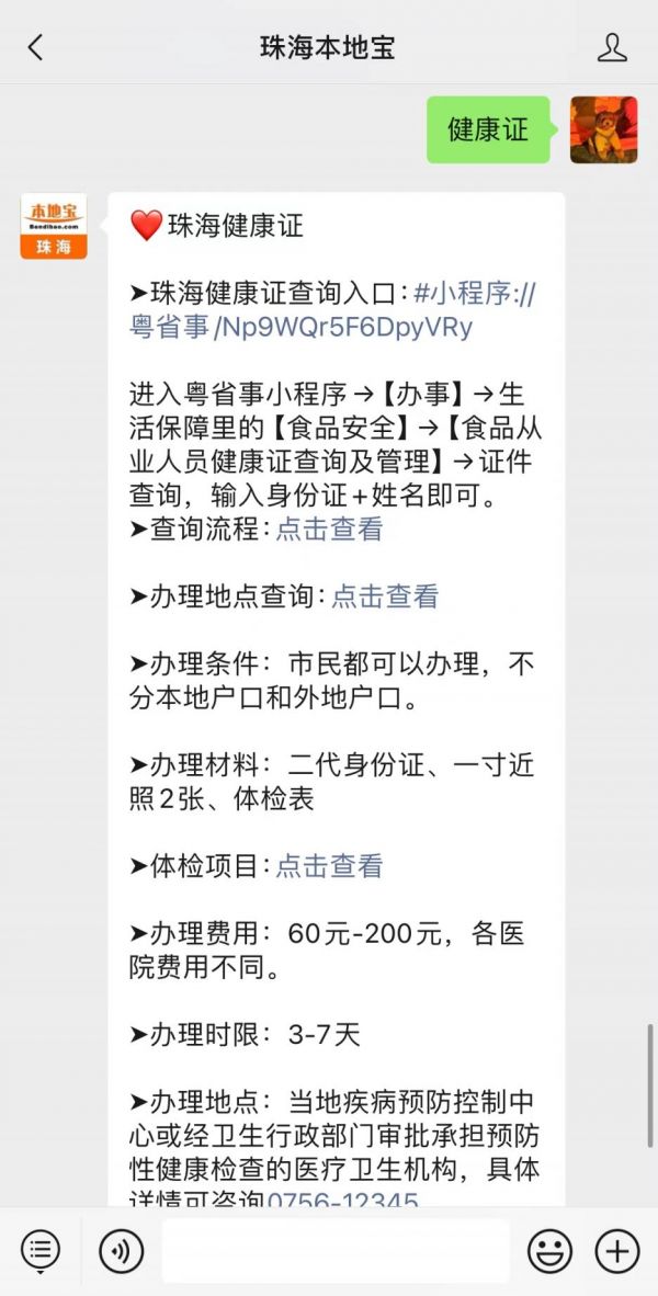 溫馨提示:微信搜索公眾號(hào)珠海本地寶,關(guān)注后在對(duì)話框回復(fù)【健康證】可獲珠海健康證查詢(xún)信息系統(tǒng)入口,健康證辦理指南,包括體檢項(xiàng)目,辦理地點(diǎn)等。