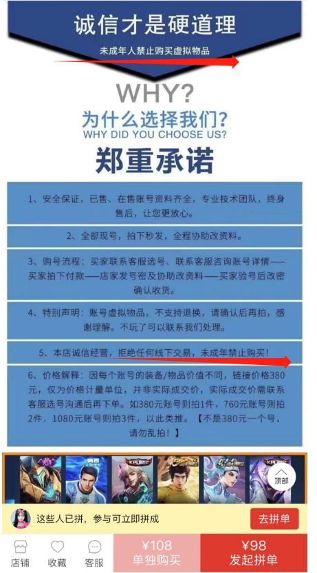 根據(jù)國家有關(guān)法律法規(guī)及平臺(tái)規(guī)則,購買網(wǎng)游類商品需年滿18周歲。在某拼單電商平臺(tái)上,一款游戲賬號(hào)商品顯示,該類商品需要先填寫實(shí)名認(rèn)證信息,滿足“18歲以上用戶”才可下單。記者咨詢?cè)撚螒蛸~號(hào)商品的客服人員,對(duì)方多次詢問購買者年齡,并明確表示“本店禁止未成年人購買賬號(hào)?!?/p>
