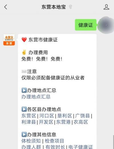 溫馨提示:微信搜索公眾號(hào)【東營(yíng)本地寶】,關(guān)注后在對(duì)話框回復(fù)【健康證】可獲東營(yíng)健康證辦理醫(yī)院、檢查須知、有效時(shí)長(zhǎng)、檢查項(xiàng)目等信息,還可以查詢醫(yī)保等相關(guān)內(nèi)容!持續(xù)關(guān)注我們,為您提供東營(yíng)更多民生內(nèi)容!