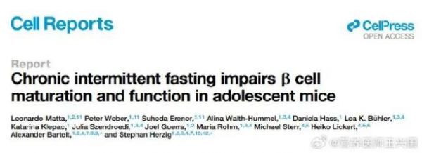 " Cell Reports "期刊發(fā)表來(lái)自德國(guó)慕尼黑亥姆霍茲中心的動(dòng)物實(shí)驗(yàn)研究(下圖),長(zhǎng)期輕斷食并不適合所有年齡段,對(duì)老年小鼠有益,但對(duì)年輕小鼠有害。長(zhǎng)期輕斷食(10周)會(huì)損害年輕小鼠β細(xì)胞功能和成熟,表明年輕時(shí)長(zhǎng)期輕斷食與β細(xì)胞功能障礙有關(guān),從而增加糖尿病風(fēng)險(xiǎn)。