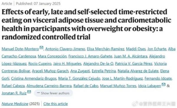 《自然·醫(yī)學(xué)》雜志發(fā)表來(lái)自西班牙的研究(下圖),招募近200名超重或肥胖的成年人進(jìn)行為期12周的飲食干預(yù)試驗(yàn)。結(jié)果表明,與單純地中海飲食相比,地中海飲食+限時(shí)進(jìn)食(間歇性禁食)的組合不會(huì)進(jìn)一步提高與內(nèi)臟脂肪和心血管代謝相關(guān)的健康益處,不過會(huì)有額外一點(diǎn)兒減肥、降血糖效果。