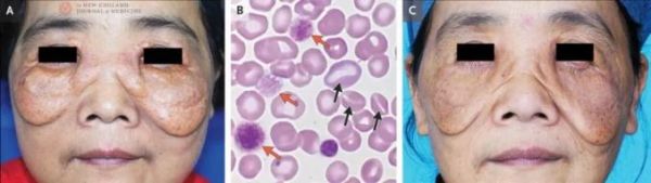 一名50歲中國(guó)女性,眼睛下方腫物5年(下圖A),眶下區(qū)域可見黃色硬斑(活檢結(jié)果顯示為黃色肉芽腫)。實(shí)驗(yàn)室檢查發(fā)現(xiàn)血液低密度脂蛋白膽固醇(LDL—C)水平異常升高。