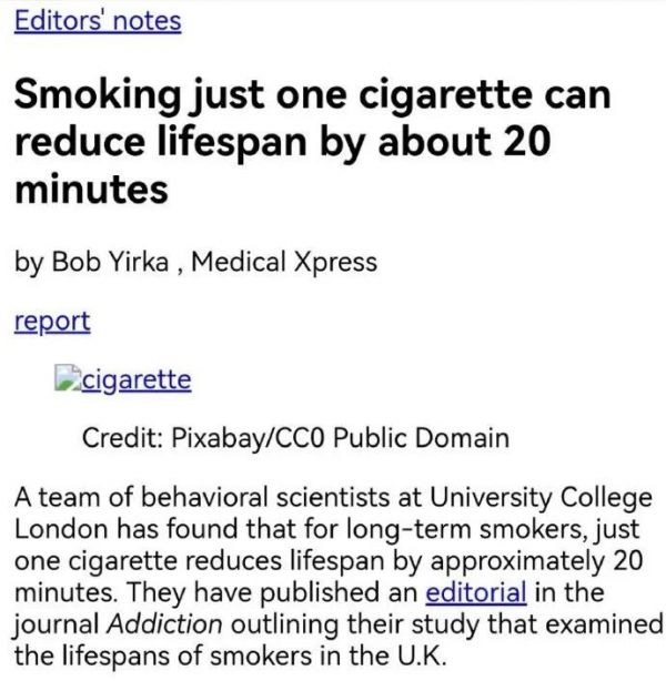 《成癮》(Addiction)發(fā)表一項(xiàng)研究,研究者精確計(jì)算了平均一支煙會(huì)如何影響男性和女性壽命。結(jié)果顯示,在長(zhǎng)期吸煙者中,每多吸一支煙平均會(huì)使男性的預(yù)期壽命縮短17分鐘,女性的預(yù)期壽命縮短22分鐘。