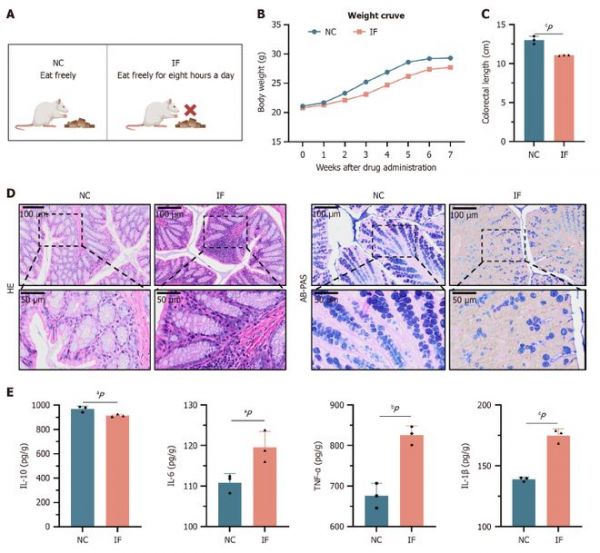 結果發(fā)現(xiàn),間歇性禁食組結腸長度顯著縮短,炎癥細胞浸潤增加,腸道屏障功能受損,促炎細胞因子(TNF-α、IL-1β、IL-6)水平顯著升高,而抗炎細胞因子IL-10表達降低。