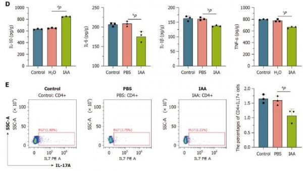 不僅如此,研究人員還驗證IAA的潛在治療效果,體外實驗和動物實驗顯示,IAA能顯著降低Th17細胞的分化,小鼠補充IAA可顯著減少炎癥細胞浸潤,降低促炎細胞因子水平,升高抗炎細胞因子水平,Th17細胞比例降低。