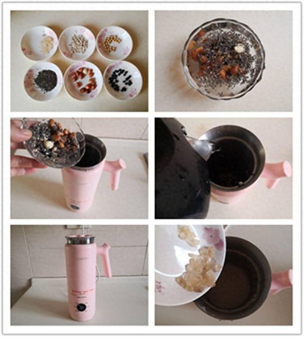原料: 黃豆 1勺 薏仁米 1勺 黑豆 1勺 黑芝麻 1勺 花生米 1勺 冰糖 少許