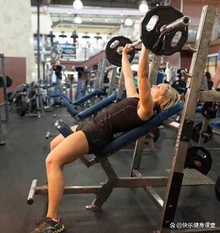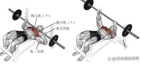 上斜杠鈴臥推:針對上胸部,頭部高于軀干,利用重力更好地集中刺激上胸部位。