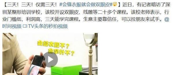 一些整形美容培訓(xùn)機構(gòu)甚至打著“會縫衣服就會做雙眼皮”“培訓(xùn)三天出師”的旗號“催促”整形行業(yè)的發(fā)展,這讓我們怵目驚心。