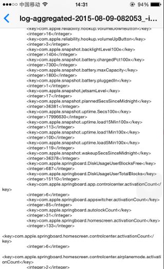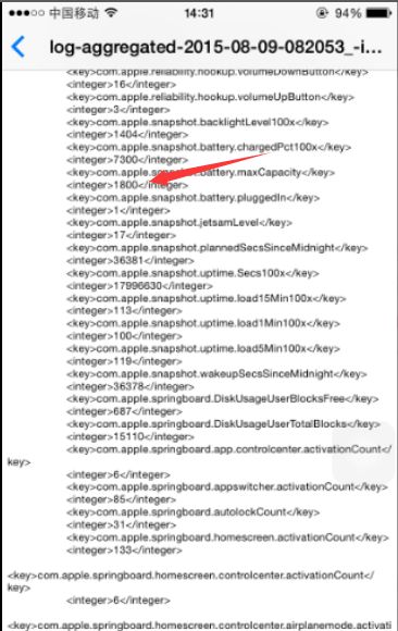 接著在彈出田袁現(xiàn)度算聽的較矛的日志中找到這樣的數(shù)據(jù):“<key>com.apple.snapshot.battery.maxCapacity</key><integer>XXXX</integer>”,日志中的數(shù)據(jù)非常多,建議從底部開始找,因?yàn)檫@行數(shù)據(jù)基本上在頁面的底部。