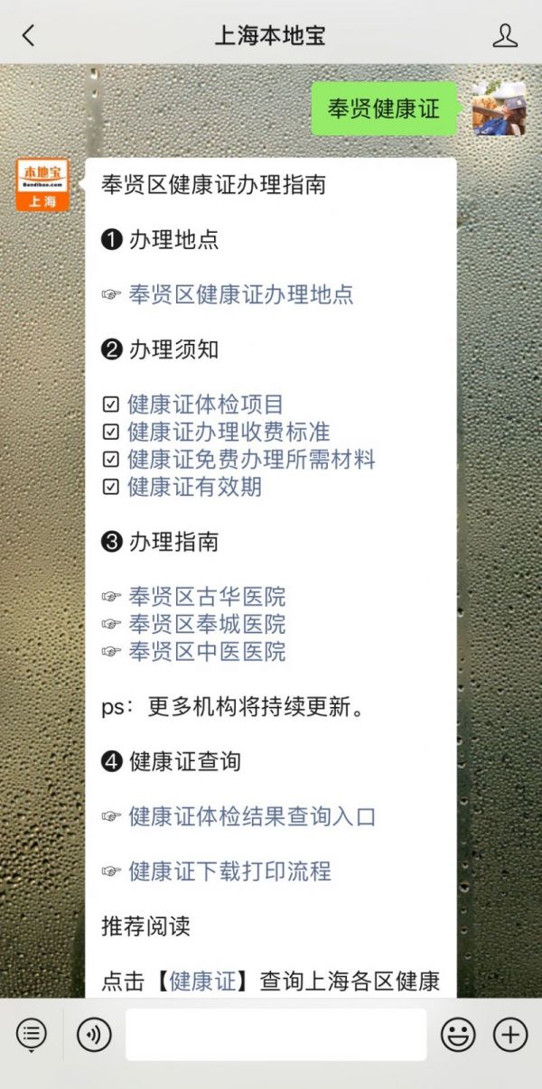溫馨提示:微信搜索【上海本地寶】公眾號,關(guān)注后在對話框回復(fù)【奉賢健康證】獲取上海奉賢區(qū)健康證辦理地點(diǎn)及時間、體檢項目、收費(fèi)標(biāo)準(zhǔn)、免費(fèi)辦理條件、健康證辦理結(jié)果查詢?nèi)肟凇⑾螺d打印流程等。