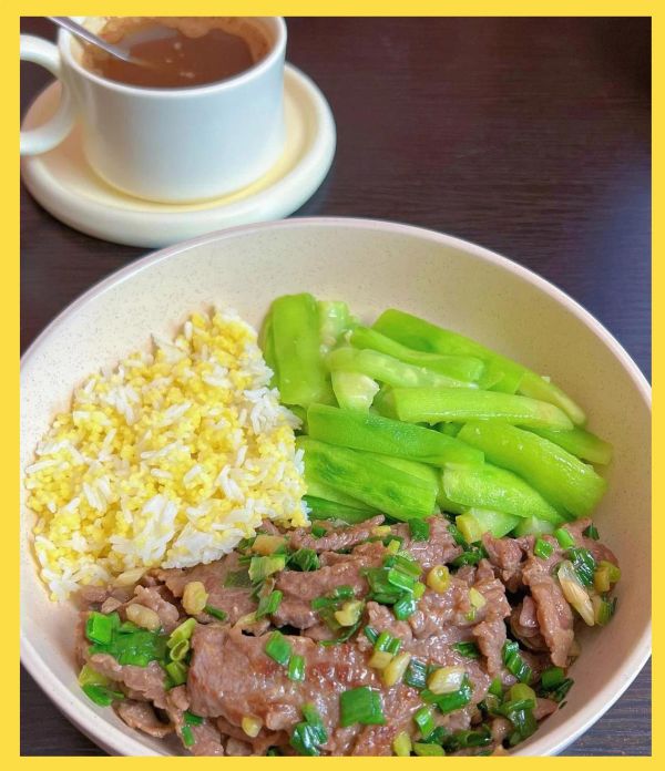 第四套便當(dāng)搭配為蔥花牛肉、絲瓜和小米白米飯。蔥花牛肉需用生抽和少量淀粉腌制后,在熱鍋中輕滑炒制,出鍋前撒上大量蔥花以增香。絲瓜切段后清炒,出鍋前加入少許蠔油提鮮,同時注意控制鹽量。小米與白米混合煮制,既保留了粗糧的纖維感,又讓口感更加豐富多樣,特別適合工作繁忙但希望控制血糖波動的人群。