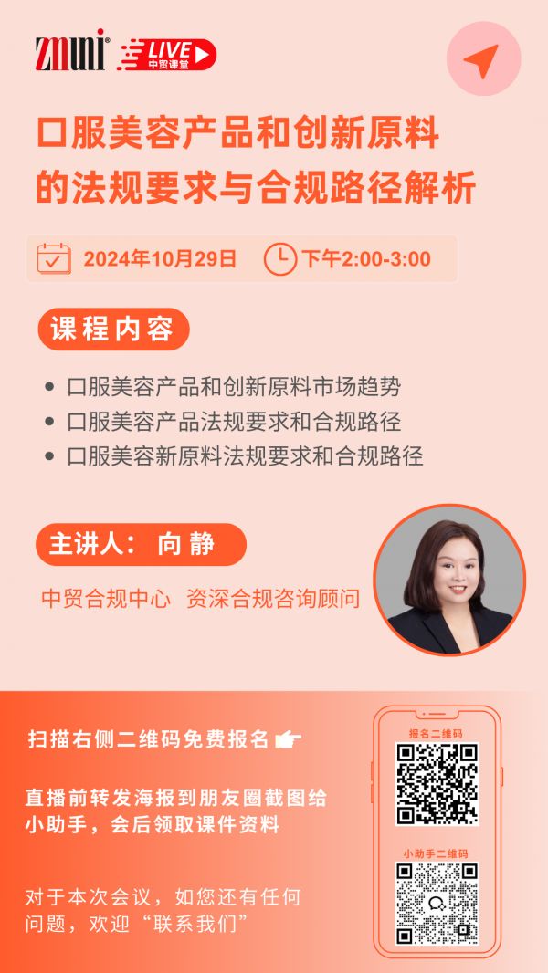 全球口服美容市場增長快速,2022年該市場規(guī)模已攀升至65億美元,從全球范圍來看,亞太地區(qū)口服美容產(chǎn)品市場份額位居全球首位。其中,日本和中國是亞太區(qū)口服美容市場的主要驅(qū)動力。中國口服美容行業(yè)快速發(fā)展,功能性食品成主流品類。當前中國口服美容行業(yè)處于蓬勃發(fā)展的快速增長期。中貿(mào)于2024年10月29日下午2點對于口服美容行業(yè)的產(chǎn)品和創(chuàng)新原料的進行法規(guī)與合規(guī)路徑的解析。
