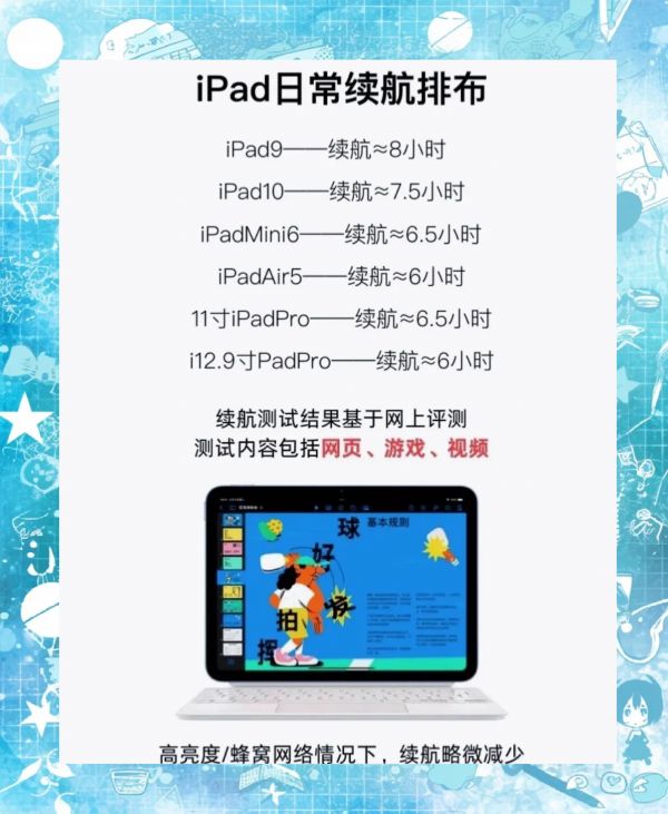 11寸iPad Pro的續(xù)航時(shí)間約為6.5小時(shí),而12.9寸iPad Pro的續(xù)航則約為6小時(shí)。這些數(shù)據(jù)來(lái)自網(wǎng)絡(luò)測(cè)評(píng),涵蓋了網(wǎng)頁(yè)瀏覽、游戲、視頻播放等多種場(chǎng)景,且在高亮度和蜂窩網(wǎng)絡(luò)環(huán)境下進(jìn)行了測(cè)試,實(shí)際續(xù)航可能會(huì)略有減少。
