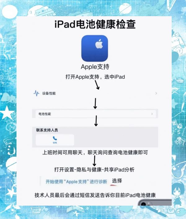 與蘋(píng)果手機(jī)不同,iPad系統(tǒng)中并未直接提供“電池健康”選項(xiàng)供用戶查看電池狀態(tài)。然而,iPad用戶仍可以通過(guò)其他途徑了解電池健康狀況。其中,最簡(jiǎn)便且權(quán)威的方法是下載并使用「Apple 支持」APP,向Apple的技術(shù)支持團(tuán)隊(duì)尋求幫助。在APP中,用戶可以選擇自己的iPad設(shè)備,然后依次點(diǎn)擊“設(shè)備性能”和“電池性能”選項(xiàng),與技術(shù)支持人員通過(guò)“聊天”功能進(jìn)行溝通。隨后,客服人員將為用戶提供詳細(xì)的電池健康檢查指南。