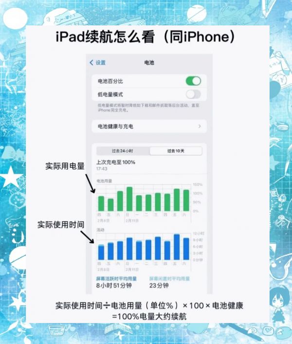 打開(kāi)iPad的設(shè)置,點(diǎn)擊電池選項(xiàng),即可查看iPad的續(xù)航實(shí)際用量和實(shí)際使用時(shí)間。接下來(lái),我們可以通過(guò)一個(gè)簡(jiǎn)單的計(jì)算方法來(lái)估算續(xù)航:實(shí)際使用時(shí)間除以電池用量(以百分比表示)再乘以電池健康度,即可得出100%電量大約能續(xù)航多久。通過(guò)這種方式,我們可以對(duì)比不同iPad型號(hào)的續(xù)航性能。