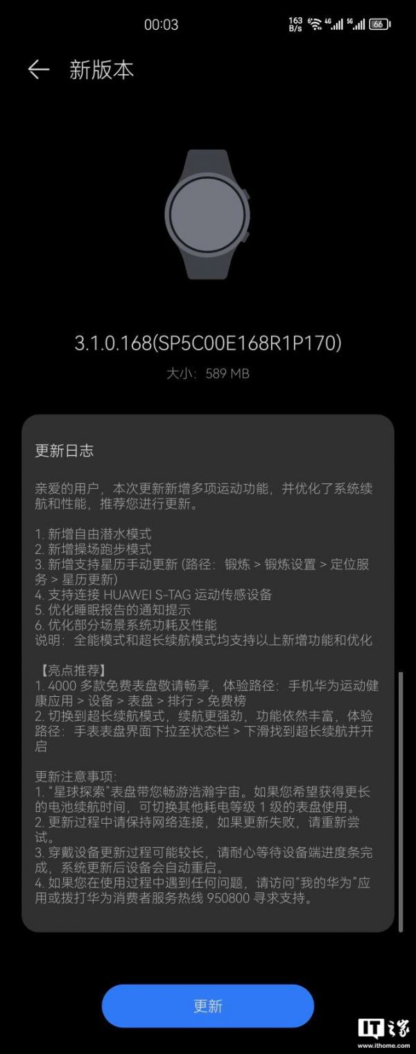 IT之家 8 月 2 日消息,華為近日向華為 Watch4 Pro 智能手表推送了 HarmonyOS 固件更新,固件版本為 3.1.0.168 (SP5C00E168R1P170) ,此次固件大小為 589MB,新增了多項(xiàng)運(yùn)動模式,并針對睡眠、系統(tǒng)功耗方面進(jìn)行了優(yōu)化,詳情如下: