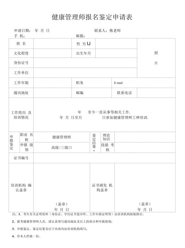 健康管理師報(bào)名鑒定申請(qǐng)表申請(qǐng)日期年月日聯(lián)系人熊老師手機(jī)郵箱注