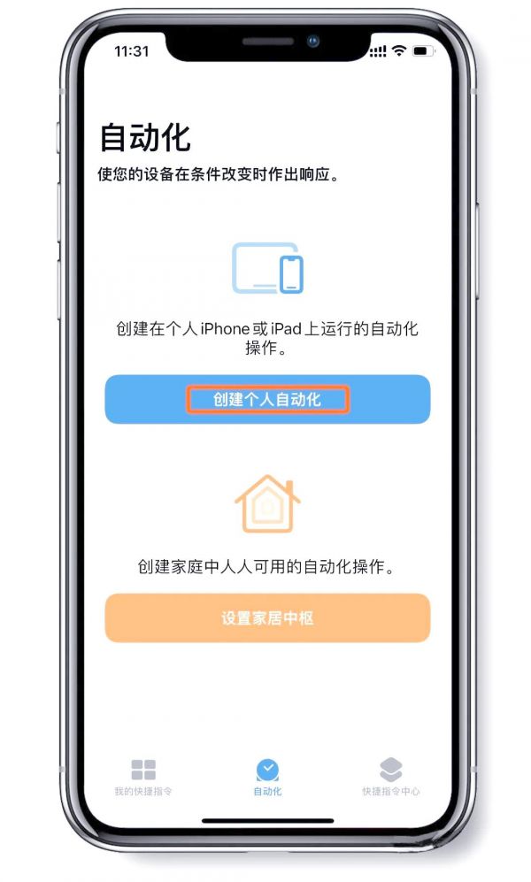 接下來(lái),在“快捷指令”應(yīng)用中,我們點(diǎn)擊“創(chuàng)建個(gè)人自動(dòng)化”按鈕,開(kāi)啟新的一步。