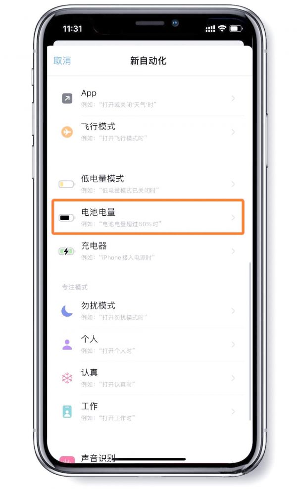 接下來(lái),在“創(chuàng)建個(gè)人自動(dòng)化”的界面中,我們需要進(jìn)一步選擇一個(gè)觸發(fā)條件。而在這個(gè)場(chǎng)景下,我們特別關(guān)注電池電量的變化。因此,我們可以選擇“電池電量”作為觸發(fā)條件,以開(kāi)啟下一步的操作。