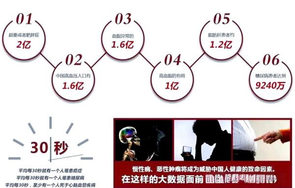 中國面臨嚴峻的健康問題,多項數(shù)據(jù)顯示問題嚴重。高血壓人口已達1.6至1.7億,高血脂患者也超過1億。糖尿病患病率更是高達9240萬,同時,超重或肥胖癥患者也占到了7000萬至2億人的龐大比例。此外,血脂異常和脂肪肝問題也不容忽視,分別有1.6億和1.2億患者。更令人擔憂的是,每30秒就有一人罹患癌癥或糖尿病,同時,心腦血管疾病也在威脅著人們的生命,平均每30秒就有人因此離世。