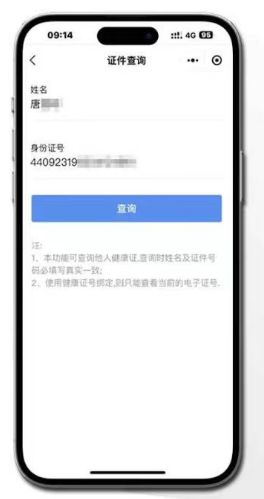 3、查別人健康證:點證件查詢并輸入身份信息可查詢他人健康證信息。