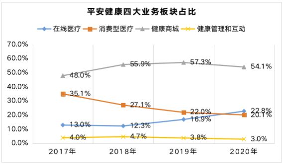 在成立之初,平安健康構(gòu)建了“家庭醫(yī)生(在線醫(yī)療)、消費(fèi)型醫(yī)療、健康商城、健康管理和互動(dòng)”四大業(yè)務(wù)板塊,家庭醫(yī)生面向壽險(xiǎn)客戶提供在線咨詢、轉(zhuǎn)診、掛號(hào)、住院安排等服務(wù);消費(fèi)型醫(yī)療為企業(yè)和個(gè)人客戶提供體檢、醫(yī)美等線下服務(wù);健康商城則是電商業(yè)務(wù),提供包括藥品、營養(yǎng)保健品、醫(yī)療器械、母嬰用品、運(yùn)動(dòng)健身用品等產(chǎn)品;健康管理和互動(dòng)主要面向企業(yè)客戶提供廣告服務(wù)。