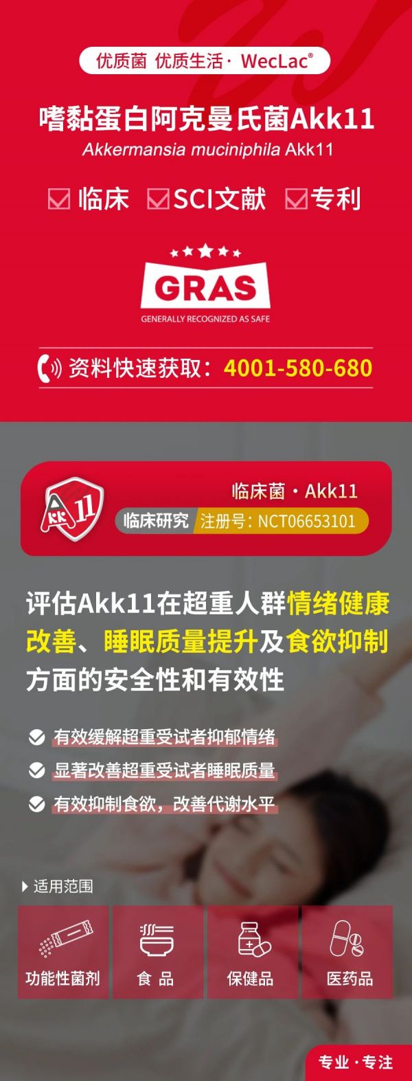 [1]本臨床研究采用了微康益生菌嗜黏蛋白阿克曼氏菌Akk11,評估Akk11在超重人群情緒健康改善、睡眠質(zhì)量提升及食欲抑制方面的安全性和有效性。