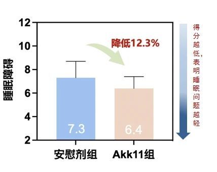 睡眠質(zhì)量一般用匹茲堡睡眠質(zhì)量指數(shù)(PSQI)得分表示,得分越高,表明睡眠障礙越嚴重。在接受Akk11干預(yù)8周后,受試者的匹茲堡睡眠質(zhì)量指數(shù)得分顯著降低,表明Akk11可以顯著改善超重患者的睡眠質(zhì)量。