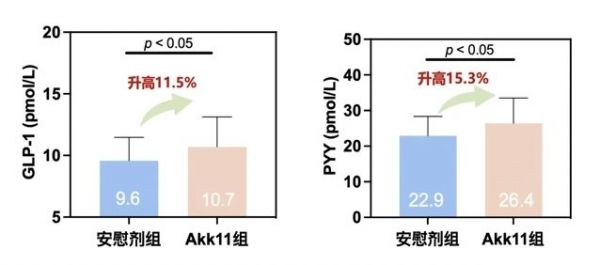 GLP-1和PYY是一種由腸內(nèi)分泌細胞(ECC)表達和分泌的腸道激素, 通過產(chǎn)生飽腹感來控制食欲。睡眠不足會抑制腸道L細胞分泌GLP-1和PYY,導(dǎo)致其濃度下降。用Akk11干預(yù)8周后,受試者血液中GLP-1和PYY表達量顯著上調(diào),進一步表明Akk11干預(yù)后可以改善受試者睡眠質(zhì)量,從而提高血液中GLP-1和PYY的濃度,抑制食欲,改善超重受試者的代謝水平。