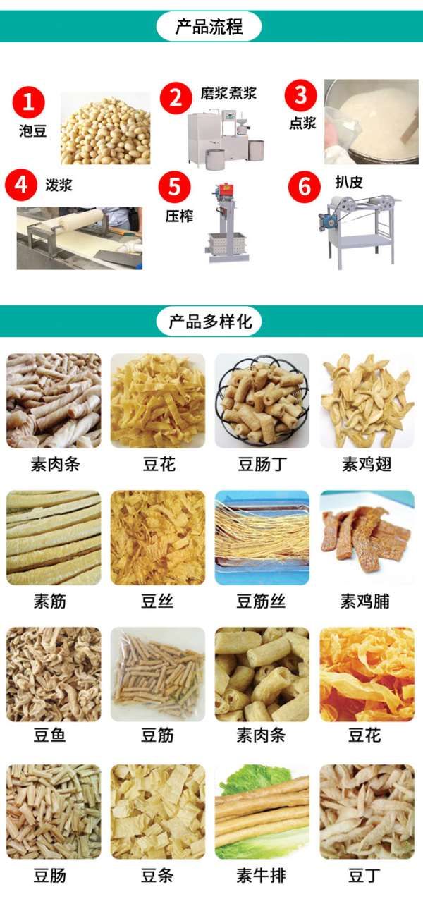 大豆是我國主要的油料作物,南北均有,但是長期以來,對大豆加工于生產(chǎn)榨油的加工,對于其生產(chǎn)后的豆粕副產(chǎn)品沒有得到深層次的開發(fā)和利用,因此,多功能黃豆制品機利用冷榨豆油的豆粕粉碎成面以后,可以生產(chǎn)豆皮、豆排、豆筋、豆絲、豆蝦、雞翅等多種高蛋白低脂肪的植物蛋白肉制品,亦稱“素肉制品”或“人造蛋白肉”,這種豆制品因 為經(jīng)過200攝  氏度  以上高溫脫脂脫腥,加熱膨化而成,含大豆蛋白質(zhì)50%以上,它的色澤、食感、結(jié)構(gòu)、韌性均與動物肉相似,賴氨酸含量更優(yōu)于其他植 物蛋白并且無毒、無害無病菌,營養(yǎng)豐富,而其優(yōu)點之處是不含,沒有動物肉類的副作用,是一種健康產(chǎn)品,對人體十分有益。因此,該食品符合目前人們追求健康,喜吃的時尚觀念,原料豐富,而且品種繁多,市場需求量大,所以其市場前景十分廣闊,必將產(chǎn)生良好的經(jīng)濟效益和社會效益。