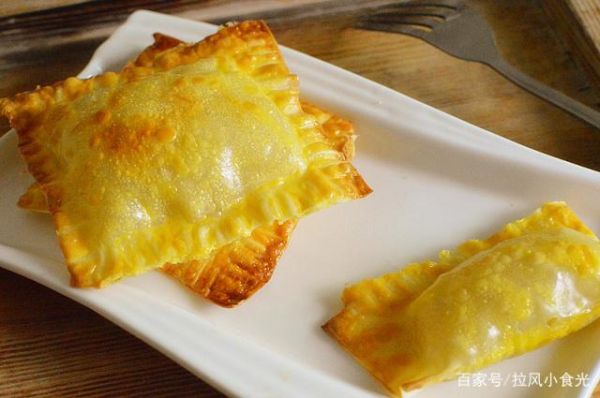 4.舀一勺蘋果陷,放在餛飩皮上,面上再蓋一層餛飩皮,每邊都有叉子按壓封口,要壓緊一點,不然蘋果陷加熱后會溢出來。