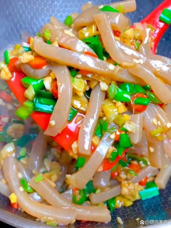 2、鍋中燒油,油熱放入姜末、蒜末、青紅椒和泡椒煸炒出香味,再倒入焯好水的魔芋,加入鹽、生抽、蠔油、胡椒粉,開大火翻炒均勻。
