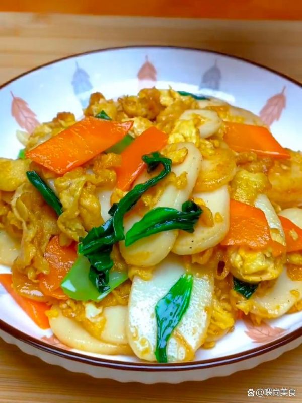 準(zhǔn)備食材:年糕、雞蛋、胡蘿卜、小油菜。
