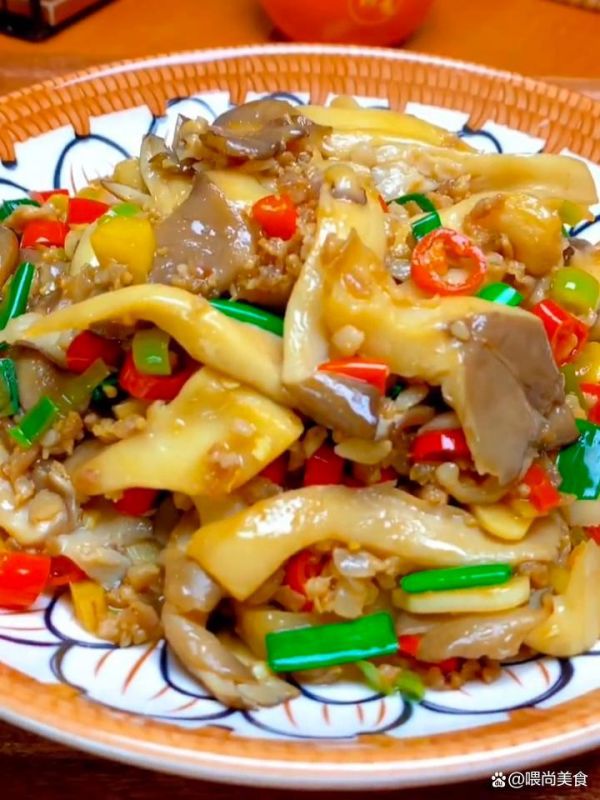 準(zhǔn)備食材:鮮蘑、肉末、蔥、姜、蒜、小米辣、蒜苗葉。