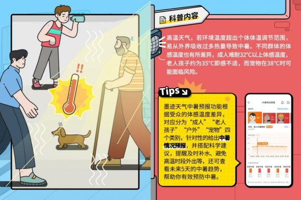 高溫天氣,行走在路上,就仿佛走進(jìn)了天然桑拿房,分分鐘汗如雨下。當(dāng)我們所處環(huán)境溫度超出個(gè)體體溫調(diào)節(jié)范圍時(shí),不管是大人、小孩還是寵物都有中暑風(fēng)險(xiǎn)。墨跡天氣溫馨提醒,出門前可查看當(dāng)日中暑預(yù)報(bào)及未來(lái)5天中暑趨勢(shì)預(yù)測(cè),并及時(shí)獲取個(gè)性化防暑建議,讓你提前規(guī)劃,科學(xué)防暑,健康無(wú)憂。