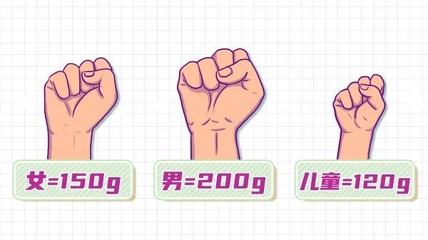 一般來說,中等身材的女性,一個拳頭大小食物的重量相當于150g;男性稍重一些,相當于200g食物量;而兒童,還有一些身材非常瘦小的女性,一個拳頭的重量則相當于120g的食物量。