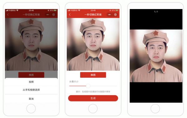 10、AI人臉換裝,一秒即可快速換裝,穿上紅軍服,戴上紅軍帽。利用目前最火的AI技術(shù),進行人臉換裝。讓大家在學(xué)習(xí)的過程中還能參與互動,分享自己參加活動的圖片。