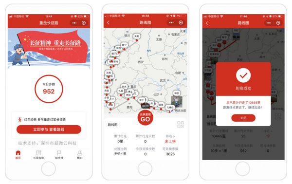 全民健身健步走紅色健步行 開展紅色健步走主題黨日活動。徒步重溫長征精神線上活動 踐行長征精神—全民健身健步走系列活動,云上重走活動采用線上比拼形式,真實模擬了紅軍二萬五千里長征的光輝歷程。參與者通過微信“掃一掃”加入云上重走長征路小程序,活動期間每天完成一定運動步數(shù)后,即可在路線圖頁面進行“云上”長征里程兌換。