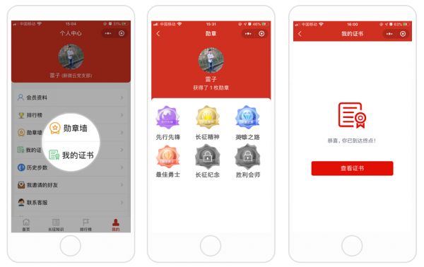 在參與活動過程中每到達一個具有革命意義的地點,參與者就可收獲紅色獎勵勛章一枚,并可了解該站點的紅軍長征歷史知識。掌握了這些知識點以后,這個小程序同時設(shè)置了答題闖關(guān),到達特定的歷史點位將開啟該點位的答題功能,答題知識點包括黨史知識、長征歷史等內(nèi)容。同時走到終點實現(xiàn)勝利會師以后,還能獲得電子證書。參與者可以轉(zhuǎn)發(fā)分享到朋友圈。獲得精神獎勵。