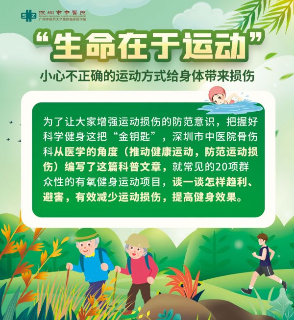 “生命在于運(yùn)動(dòng)”,但不正確的運(yùn)動(dòng)方式容易給身體帶來(lái)?yè)p傷,為了讓大家增強(qiáng)運(yùn)動(dòng)損傷的防范意識(shí),把握好科學(xué)健身這把“金鑰匙”,深圳市中醫(yī)院骨傷科從醫(yī)學(xué)的角度(推動(dòng)健康運(yùn)動(dòng),防范運(yùn)動(dòng)損傷)編寫了這篇科普文章,就常見(jiàn)的20項(xiàng)群眾性的有氧健身運(yùn)動(dòng)項(xiàng)目,談一談怎樣趨利、避害,有效減少運(yùn)動(dòng)損傷,提高健身效果。