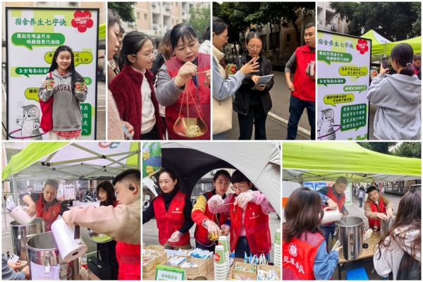 一旁的“體驗(yàn)補(bǔ)給營(yíng)”則彌漫著溫馨和暖意。菊花、枸杞、陳皮、麥冬等十余種養(yǎng)生食材在茶飲臺(tái)上整齊擺放著,同學(xué)們可根據(jù)自身需求,現(xiàn)場(chǎng)DIY一杯專屬養(yǎng)生茶。針對(duì)不同需求預(yù)配的“熒幕護(hù)盾茶”“金嗓潤(rùn)音茶”“暢中順氣飲”等茶飲尤其受歡迎?!耙槐B(yǎng)生茶,不僅溫暖手心,更傳遞著源遠(yuǎn)流長(zhǎng)的中華養(yǎng)生智慧?!币晃煌瑢W(xué)捧著自己調(diào)配的茶飲感慨道。在這里,健康不再是抽象的概念,而是可感知、可體驗(yàn)的溫暖實(shí)踐。