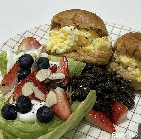早餐:水果,蔬菜,全麥面包,炒蛋,無(wú)糖酸奶