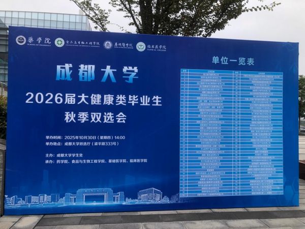 秋意漸濃,才聚成大。近日“成都大學2026屆大健康類畢業(yè)生秋季雙選會”在校雙選廳成功舉行。本次雙選會由藥學院、食品與生物工程學院、基礎(chǔ)醫(yī)學院、臨床醫(yī)學院聯(lián)合承辦,匯聚了醫(yī)療衛(wèi)生、生物制藥、食品科學等大健康領(lǐng)域的82家優(yōu)質(zhì)用人單位,為2026屆畢業(yè)生搭建起高效精準的求職平臺。