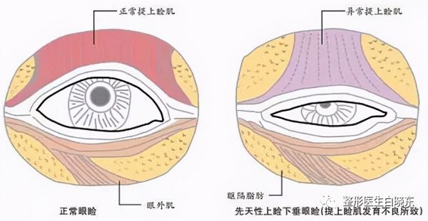 先天性上瞼下垂:上瞼提肌發(fā)育不良,或其支配神經(jīng)發(fā)育異常、功能不全所致。表現(xiàn)為出生后即存在的單側(cè)或雙側(cè)上眼瞼下垂而不能上提,輕者影響外觀,重者導(dǎo)致弱視。