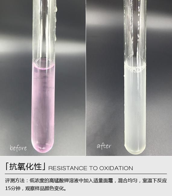 高錳酸鉀溶液由原本的淺紫色,被還原為乳白色,證明這款面霜的抗氧化能力非常優(yōu)秀。