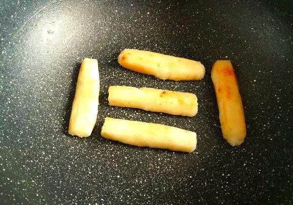 煎至年糕條的每一面都呈現(xiàn)出金黃色,質(zhì)地變得柔軟。