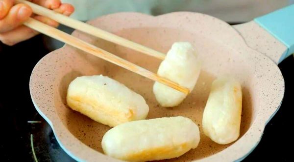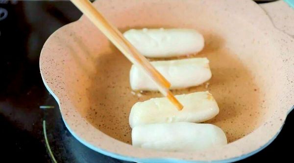 6、在平底鍋中涂抹一層薄油,以小火加熱,隨后將年糕放入鍋中,慢烙至金黃色。